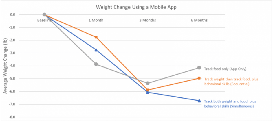 By month three, all groups, whether they tracked only food, started with weight tracking, or did both, lost roughly 5–6 pounds.
